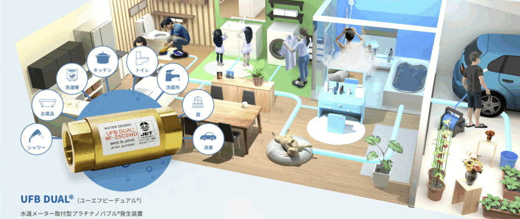 シャワーヘッドや洗濯機や給湯器と異なり、UFB DUAL®ひとつを設置すれば、家中でプラチナノバブル®の効果を享受できます。