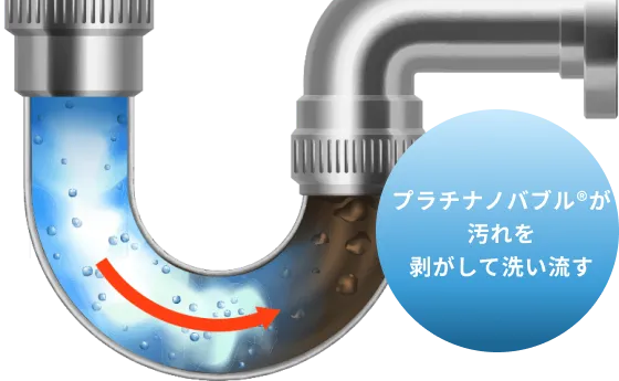 実際に、ご使用後の水にもプラチナノバブルが残っており、排水管内部を洗浄にしながら排水されます。