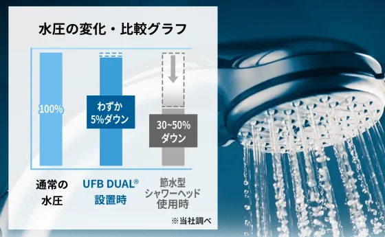 節水効果を謳う一般的なシャワーヘッドは約30〜50%も水圧が低下するのに対し、UFB DUAL®は水圧・水量ともわずか5%以内の低下におさえ、ストレスなく使用出来ます(特許技術のDUAL構造による)。